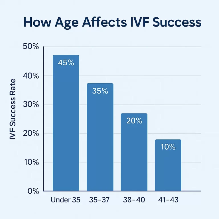 Age is one of the most important predictors of IVF success. Egg quality and quantity decline significantly after age 35, and more sharply after 40. Success rates for IVF using a person’s own eggs typically look like: